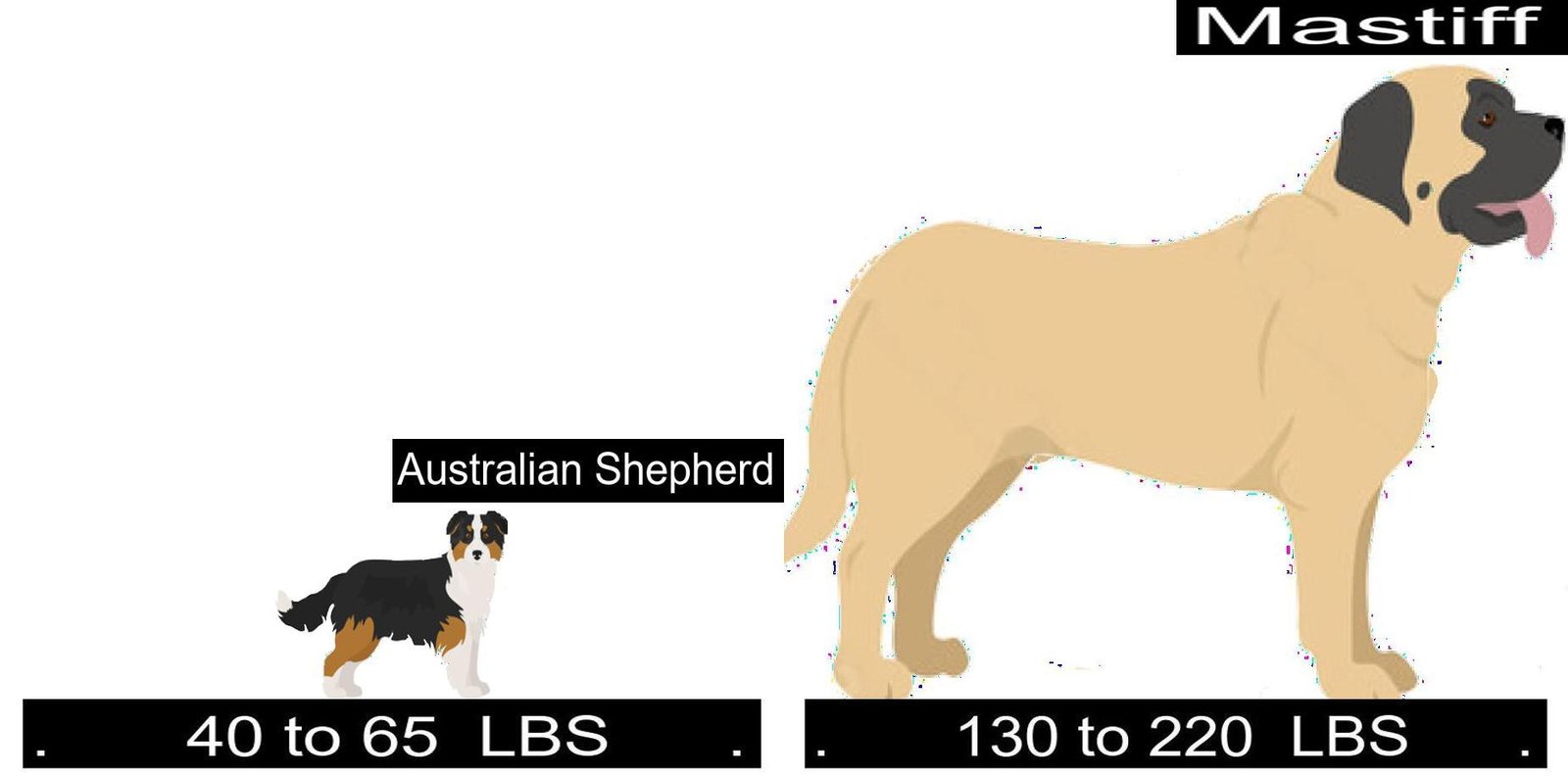 - Size Comparison of the Australian Shepherd versus Mastiff