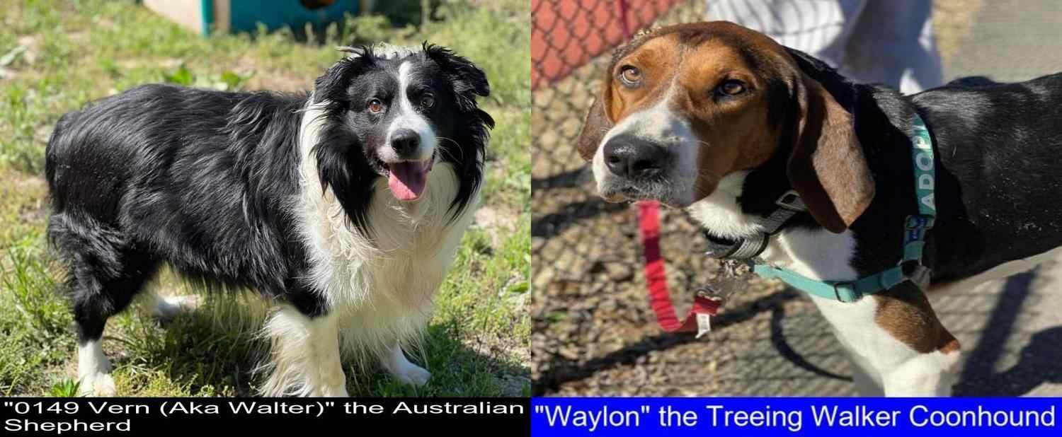 The Australian Shepherd and the Treeing Walker Coonhound can both be adopted. Images from petfinder.com