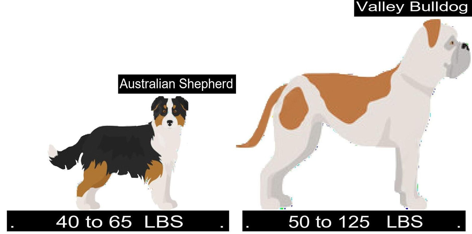 • Size Comparison of the Australian Shepherd versus Valley Bulldog